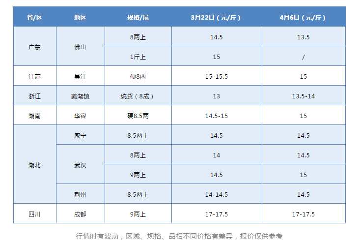4月6日,湖北地區(qū)整體行情與上月下旬相比略有上漲。其中,武漢地區(qū)8兩上的加州鱸塘頭價(jià)14.5元/斤左右,9兩上的魚(yú)15元/斤;咸寧地區(qū)8.5兩上的魚(yú)塘頭價(jià)14.5元/斤左右;荊州地區(qū),8.5兩上的加州鱸塘頭價(jià)在14.5元/斤左右。