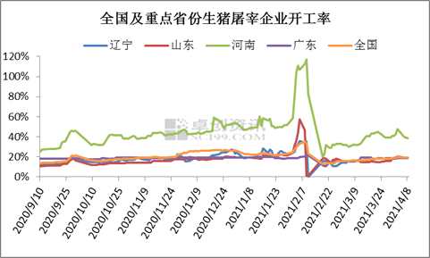 如圖2所示,據(jù)卓創(chuàng)資訊數(shù)據(jù)監(jiān)測,全國及重點(diǎn)省份生豬屠宰企業(yè)開工率低位震蕩,截止到4月8日,全國重點(diǎn)屠宰企業(yè)平均開工率19.02%,同比上漲1.84個(gè)百分點(diǎn),但仍未超20.00%。