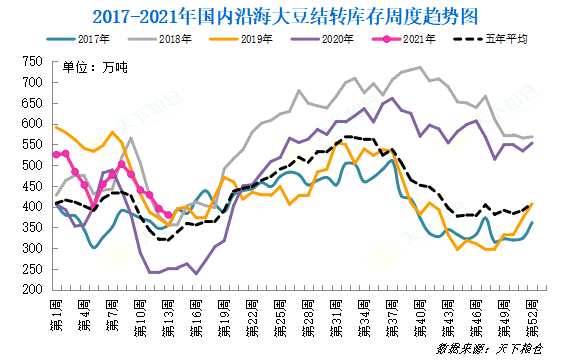 春節(jié)過后,市場傳言中儲糧最晚在4月底收儲80萬噸大豆,大豆期貨和現(xiàn)貨價格快速上漲,期貨主力合約2105更是創(chuàng)出近20年以來新高6375元/噸,而且東北產(chǎn)區(qū)更是傳遞著“豆源見底了”的聲音。隨著時間推移,中儲糧收儲的傳聞遲遲未落地,加上歷史新高后,貿(mào)易商交割利潤凸顯,以及根據(jù)調(diào)研東北豆源目前的余量不低于總產(chǎn)的50%,同時基層挺價心理出現(xiàn)松動,進口大豆替代量擠占了部分國產(chǎn)大豆的市場份額,打壓了國產(chǎn)大豆價格,隨后價格快速跳水。上周國內(nèi)大豆壓榨量上周略降至154.56萬噸,較前一周降幅為1.17%,但大豆到港量偏低,大豆庫存繼續(xù)下降。