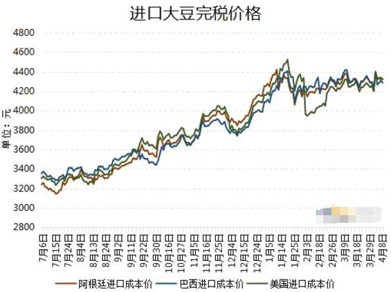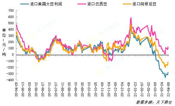 中國是全球最大的大豆和豬肉消費國,每年大豆消費量1億噸以上,產(chǎn)需缺口9000多萬噸,高度依賴進口。美國農(nóng)業(yè)部發(fā)布的出口檢驗周報顯示,截至2021年4月1日的一周,美國對中國(大陸地區(qū))裝運28,088噸大豆。前一周美國對中國(大陸地區(qū))裝運96,151噸大豆。4月8日美國大豆進口成本價為4327.65元,較上日漲2.89元。巴西大豆進口成本價為4287.03元,較上日跌22.84元。阿根廷大豆進口成本價為4320.67元,較上日跌18.52元。