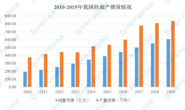 掛面是保證居民基本生活的剛需產(chǎn)品,目前已經(jīng)處于相對(duì)成熟的發(fā)展階段,增速相對(duì)平穩(wěn)。按照產(chǎn)品出廠產(chǎn)量口徑統(tǒng)計(jì),國(guó)內(nèi)掛面行業(yè)的產(chǎn)量從2010年的380.87萬噸增長(zhǎng)到2019年的839.20萬噸,復(fù)合增長(zhǎng)率8.22%;根據(jù)終端市場(chǎng)銷售規(guī)模統(tǒng)計(jì)情況,國(guó)內(nèi)掛面銷售規(guī)模從2010年193.62億元增長(zhǎng)到2019年的607.50億元,復(fù)合增長(zhǎng)率達(dá)到12.11%,高于同期我國(guó)國(guó)民生產(chǎn)總值增速。