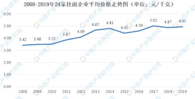 根據(jù)中國(guó)食品科學(xué)技術(shù)學(xué)會(huì)面制品分會(huì)統(tǒng)計(jì)全國(guó)24家主要掛面企業(yè)平均價(jià)格顯示,2019年掛面平均價(jià)格達(dá)4.95元/千克,較2018年略有增長(zhǎng);從2008年到2014年,掛面的平均價(jià)格從3.42元/千克持續(xù)上漲到4.81元/千克,呈現(xiàn)出較為明顯的漲幅,符合同期我國(guó)國(guó)民經(jīng)濟(jì)持續(xù)向好,消費(fèi)市場(chǎng)需求旺盛的總體特點(diǎn),同時(shí)此期間也是行業(yè)快速發(fā)展的關(guān)鍵時(shí)期。隨著掛面市場(chǎng)的整體發(fā)展逐步趨向成熟,行業(yè)競(jìng)爭(zhēng)加劇。2014年到2019年掛面平均價(jià)格在5元/千克的區(qū)域徘徊。該情況表明行業(yè)當(dāng)前依然可以通過(guò)規(guī)模效益來(lái)應(yīng)對(duì)成本壓力,高端差異化產(chǎn)品的市場(chǎng)依然有較大的增長(zhǎng)空間。