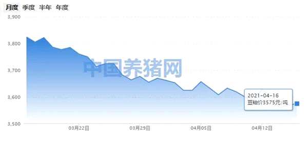 2021年04月16日(星期五),今日全國豆粕均價為3570元/噸,報價較昨日上漲了5元/噸,環(huán)比下跌6.51%,同比上漲8.23%。