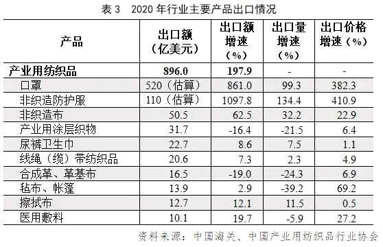 根據(jù)中國(guó)海關(guān)數(shù)據(jù),2020年我國(guó)出口各類(lèi)產(chǎn)業(yè)用紡織品(非全口徑)價(jià)值896億美元,同比增長(zhǎng)197.9%。