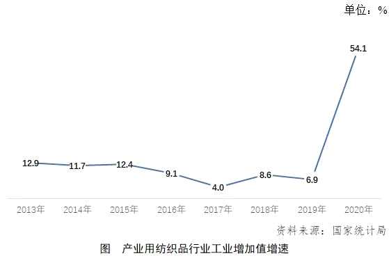 根據(jù)國(guó)家統(tǒng)計(jì)局?jǐn)?shù)據(jù),2020年我國(guó)產(chǎn)業(yè)用紡織品行業(yè)規(guī)模以上企業(yè)的工業(yè)增加值同比大幅增長(zhǎng)54.1%(如圖)。根據(jù)中國(guó)產(chǎn)業(yè)用紡織品行業(yè)協(xié)會(huì)(以下簡(jiǎn)稱(chēng)“協(xié)會(huì)”)對(duì)330家樣本企業(yè)的調(diào)研,行業(yè)2020年的景氣指數(shù)為80.4,高于上年同期水平,處于較高的景氣區(qū)間。