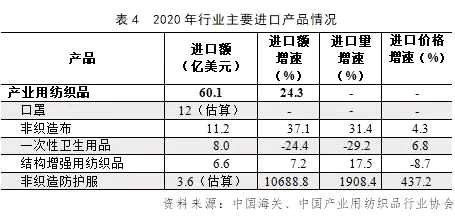 近年來(lái),隨著我國(guó)產(chǎn)業(yè)用紡織品的技術(shù)創(chuàng)新不斷取得突破,我國(guó)進(jìn)口產(chǎn)業(yè)用紡織品的需求正逐年降低,但疫情的爆發(fā)打破了這一規(guī)律。2020年初由于醫(yī)用口罩、防護(hù)服產(chǎn)能缺口較大,我國(guó)開(kāi)始從海外市場(chǎng)大量采購(gòu)口罩、防護(hù)服等防疫物資以滿足國(guó)內(nèi)的防疫需求。根據(jù)不完全統(tǒng)計(jì),2020年,我國(guó)進(jìn)口產(chǎn)業(yè)用紡織品價(jià)值60.1億美元,同比增長(zhǎng)24.3%。