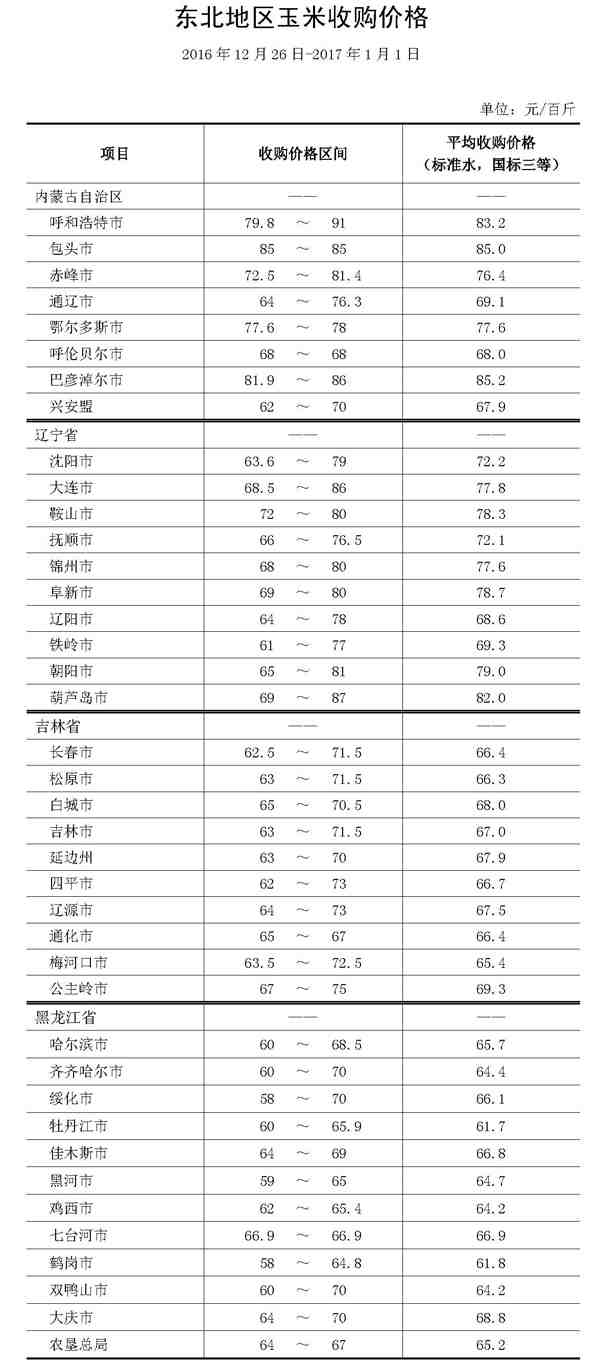 據(jù)國家糧油信息中心監(jiān)測,2016年12月26日~2017年1月1日,東北地區(qū)玉米收購價格總體平穩(wěn),部分地區(qū)較前期小幅回落。分地區(qū)玉米收購價格見下表: