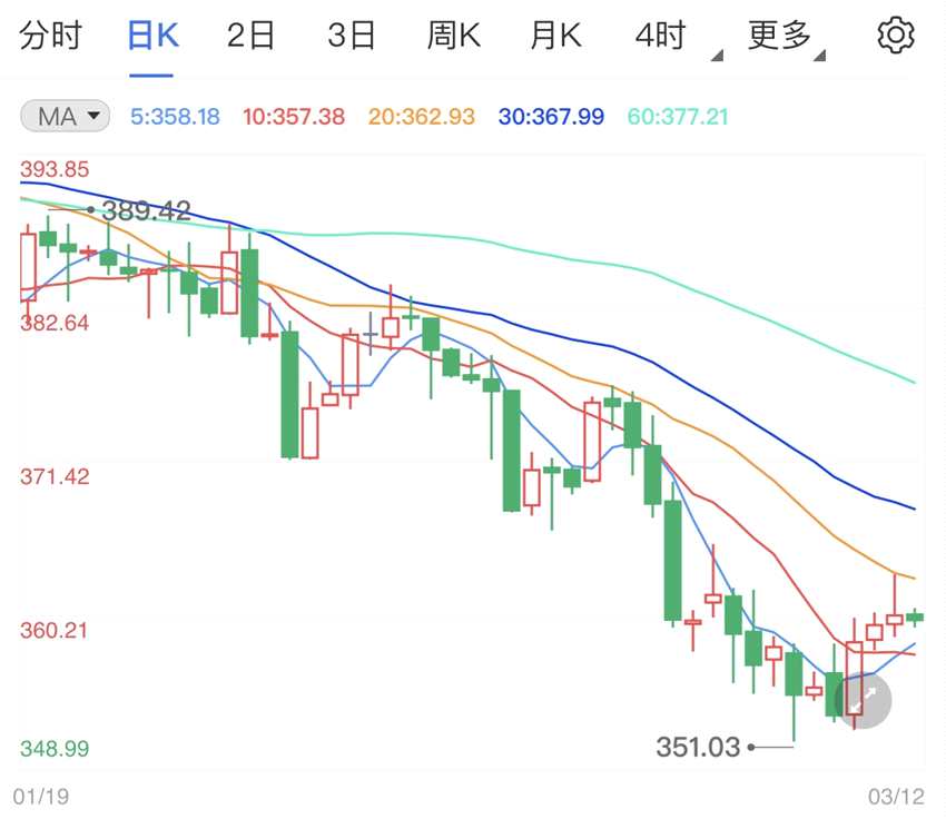 今天周五(3月12日),紙黃金價(jià)格盤內(nèi)暫報(bào)357.94元/克,短線黃金(GOLD)偏陰布局,黃金價(jià)格360元/克大關(guān)之下區(qū)間震蕩,走勢圖日線金價(jià)前景走勢如何?