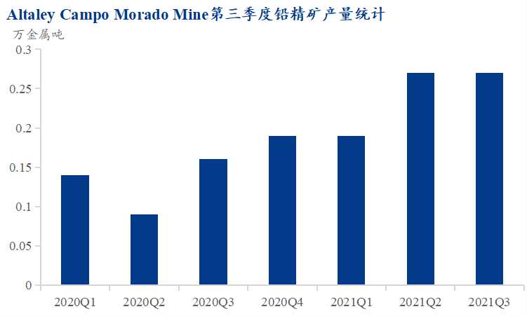Altaley2021年3季度鉛精礦產(chǎn)量為0.27萬噸,同比增加67.08%,環(huán)比增加1.51%。