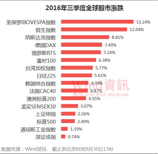 三季度全球主要股市全線上漲,上證綜指和深證成指分別上漲2.56%、0.74%,圣保羅IBOVESPA指數(shù)漲逾13%奪魁。