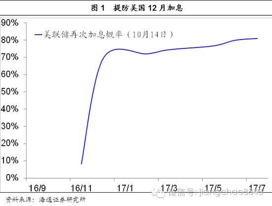 在8月初時,期貨市場預(yù)期美國12月加息的概率不到50%,而目前已經(jīng)升至70%。意味著在今年12月美聯(lián)儲大概率會啟動本輪第二次加息。與此相應(yīng),美國10年期國債利率從8月的1.5%升至目前的1.8%,升幅約30bp。