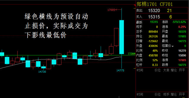 我棉花預(yù)設(shè)的止損位,在經(jīng)過(guò)晚上棉花再次漲停后,已經(jīng)距離最高價(jià)超過(guò)10%(可以想象下,8-10倍杠桿的市場(chǎng),10%是多么驚人的數(shù)字,要知道,晚上棉花漲停,也不過(guò)漲了5%),這么遠(yuǎn)的距離被擊穿不算,還實(shí)際賣在了跌停板價(jià)格上,比預(yù)想的損失多很多。