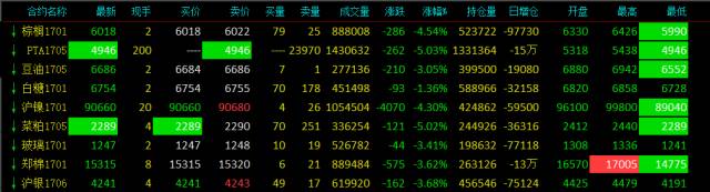 急忙一看,驚天巨變,自選合約竟然滿屏跌停!最不可思議的棉花,直接從漲停砸到跌停。(圖最后兩欄的紅色背景框,表示漲停價(jià),綠色背景框,表示跌停價(jià))