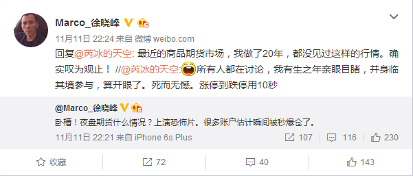 各個(gè)和期貨相關(guān)的群開(kāi)始騷動(dòng),各類自媒體上也有消息不斷傳出。如果說(shuō)這晚的商品期貨是一場(chǎng)大地震,那么和大地震唯一的區(qū)別在于:通訊聯(lián)系沒(méi)有受到影響,可以用最快速度知道災(zāi)情。