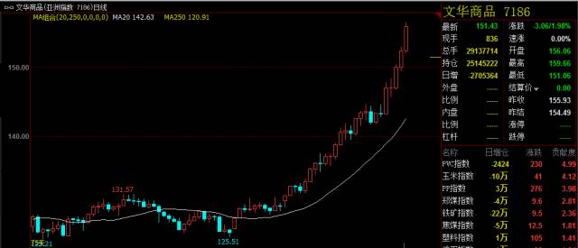 打開(kāi)交易軟件的時(shí)候我驚呆了,文華商品指數(shù)再次大漲接近2.5%,鐵礦、棉花等品種早早封上漲停,其余各個(gè)品種也都漲幅巨大。