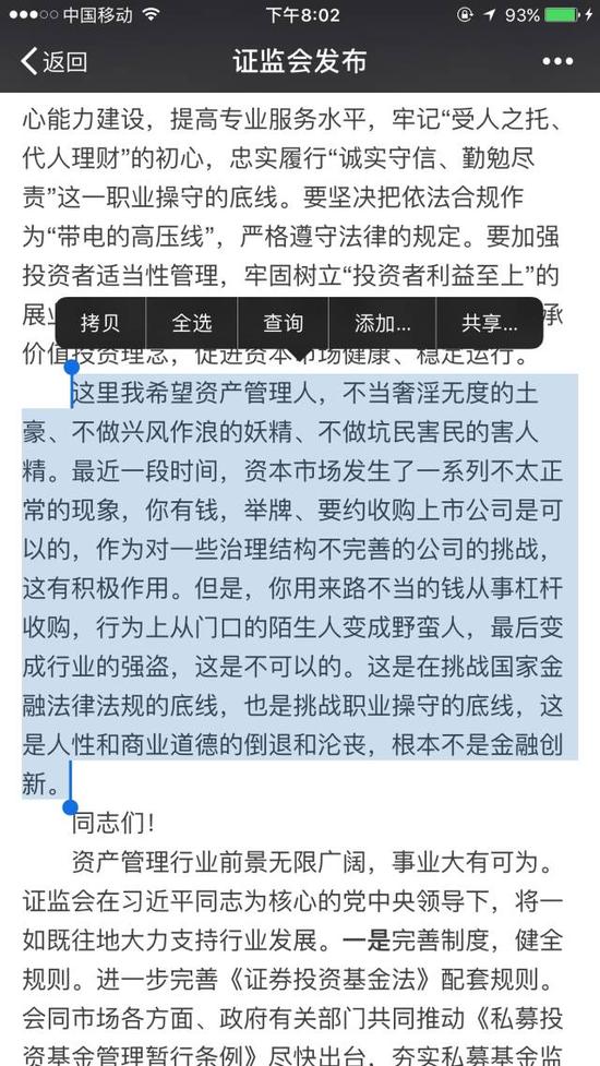 他并未在講話中直接點名所謂“土豪”、“妖精”、“害人精”的主體,何況他講話的場合是在中國證券投資基金業(yè)協(xié)會第二屆第一次會員代表大會,臺下的聽眾是資產(chǎn)管理行業(yè)人士。