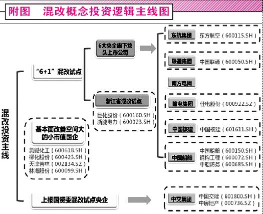 券商同樣認(rèn)為2017年是深化國(guó)企改革的一年,其中混改將成為重點(diǎn)突破的方向。根據(jù)廣發(fā)證券《深化國(guó)改,混改突破》研報(bào)中表示,“在投資主線上,我們重點(diǎn)建議關(guān)注混改受益的三條邏輯主線(附圖):央企混改‘6+1’、基本面改善空間較大的小市值國(guó)企、已經(jīng)上報(bào)國(guó)資委的‘混改’試點(diǎn)集團(tuán)下屬上市公司。”