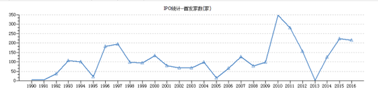 1、2016年共215只新股上市,歷史排名第4,巔峰年代是2010年,發(fā)行348家。