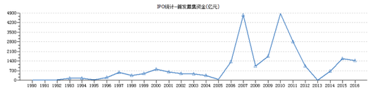 盡管IPO一度被視為抽取資金的“洪水猛獸”,但在A股歷史記錄中,IPO募資金額超過千億的年份卻很少,加上2016年總共也只有9個(gè)年頭,其中募資超過3000億元的只有2010年和2007年。