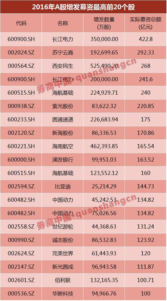 數(shù)據(jù)顯示,今年700多家實(shí)施增發(fā)的上市公司中,有50家公司通過增發(fā)募集資金超50億元,21家公司募資總額超過100億元,長(zhǎng)江電力、蘇寧云商、西安民生、長(zhǎng)江電力、海航基礎(chǔ)和紫光股份等6家公司募資規(guī)模超過200億元,其中長(zhǎng)江電力更是募資達(dá)到422.8億元。