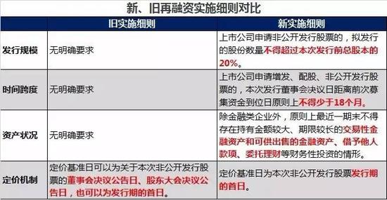 1、新、舊規(guī)定的主要差異——新規(guī)主要針對(duì)再融資規(guī)模、再融資頻率、資產(chǎn)狀況、發(fā)行定價(jià)四方面做出新的規(guī)范。第一,限制了再融資規(guī)?!鲜泄旧暾?qǐng)非公開(kāi)發(fā)行股票的,擬發(fā)行的股份數(shù)量不得超過(guò)本次發(fā)行前總股本的20%;第二,限制了再融資的頻率——再融資發(fā)行的董事會(huì)決議日距離前次募集資金到位日不得少于18個(gè)月(除可轉(zhuǎn)債、優(yōu)先股和創(chuàng)業(yè)板小額快速融資);第三,對(duì)資產(chǎn)狀況提出了更高的要求,杜絕企業(yè)明明有閑置資金仍然要再融資的行為——非金融企業(yè)如果要再融資,最近一期末不得存在持有金額較大、期限較長(zhǎng)的交易性金融資產(chǎn)和可供出售的金融資產(chǎn)、借予他人款項(xiàng)、委托理財(cái)?shù)蓉?cái)務(wù)性投資的情形;第四,優(yōu)化了定價(jià)機(jī)制——取消了將董事會(huì)決議公告日、股東大會(huì)決議公告日作為上市公司非公開(kāi)發(fā)行股票定價(jià)基準(zhǔn)日的規(guī)定,明確定價(jià)基準(zhǔn)日只能為非公開(kāi)發(fā)行股票發(fā)行期的首日。