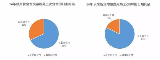 影響第三大的是再融資頻率,因?yàn)?4年以來(lái)完成定增的1650家公司中又有438家再次發(fā)布了新的定增預(yù)案(占比27%),這438家新定增預(yù)案中又有298家是在前一次定增完成后18個(gè)月以內(nèi)再次發(fā)布的(占比68%);此外,14年以來(lái)實(shí)現(xiàn)IPO的653家公司中也有100家此后實(shí)施了定增(占比16%),這100家定增公司中又有82家是在IPO后18個(gè)月之內(nèi)再次發(fā)布了定增預(yù)案(占比82%)。