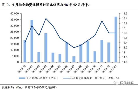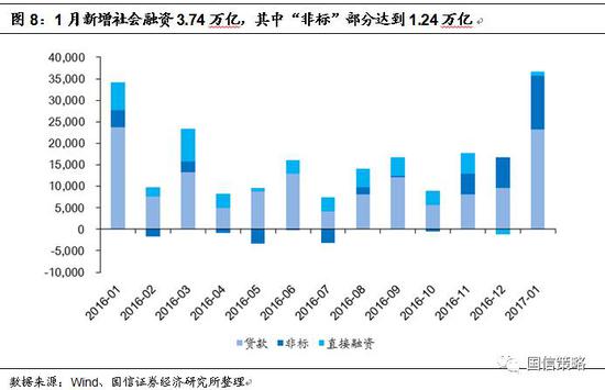 首先,從絕對(duì)量來看,1月新增社融規(guī)模,尤其是表外“非標(biāo)”部分,創(chuàng)下歷史新高,但是從增速來看,1月社融存量累計(jì)增速依舊為12.8%,保持平穩(wěn)。2017年1月新增社會(huì)融資規(guī)模為3.74萬億,超過2016年1月的3.48萬億,其中委托貸款、信托貸款以及未貼現(xiàn)銀行承兌匯票等表外“非標(biāo)”部分達(dá)到1.24萬億,高于2013年1月和2014年1月的同期水平(分別為9967億和9932億)。因此從絕對(duì)量來看,1月數(shù)據(jù)顯示出實(shí)體較為強(qiáng)勁的融資需求。但是從增速來看,1月社融存量累計(jì)同比增長12.8%,與12月份持平,仍然保持平穩(wěn)。