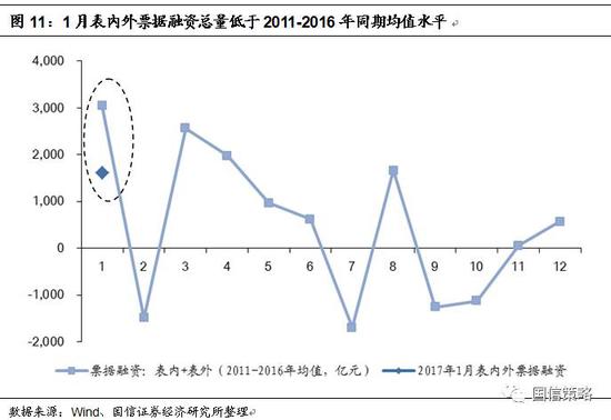 3)表外“非標(biāo)”融資達(dá)到1.24萬億,其中未貼現(xiàn)的銀行承兌匯票達(dá)到6131億,但考慮表內(nèi)減少的票據(jù)融資,表內(nèi)外票據(jù)融資總量低于2011-2016年的同期平均水平。在1月新增的1.24萬億表外“非標(biāo)”融資中,未貼現(xiàn)的銀行承兌匯票達(dá)到6131億元,創(chuàng)下歷史新高。但是從表內(nèi)信貸結(jié)構(gòu)來看,1月票據(jù)融資減少了4521億,表內(nèi)外整體票據(jù)融資總量僅1610億元,低于2011-2016年的1月平均水平(3045億元)。因此我們認(rèn)為,1月份超預(yù)期的社融規(guī)模尚不足以說明制造業(yè)投融資需求已明顯回暖,仍有待觀察。