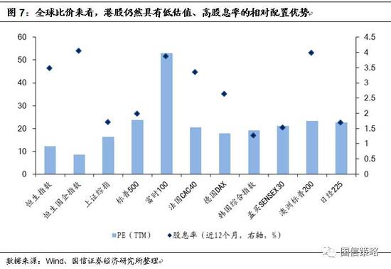 全球比價(jià)下,低估值、高股息率的港股仍然具有較高的配置價(jià)值。縱向來看,目前恒生指數(shù)和恒生國企指數(shù)的PE分別為12倍和8.5倍,低于歷史均值水平;橫向?qū)Ρ葋砜矗c其他指數(shù)相比,港股具有明顯的低估值和高股息率特征。因此從估值角度而言,港股在中長期角度仍然具有較高的配置價(jià)值。