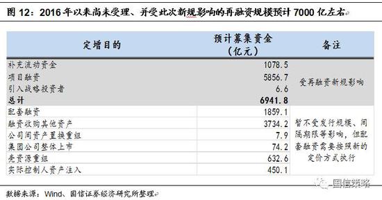 目前受到發(fā)行規(guī)模影響的未受理的再融資規(guī)模在7000億元左右,超過1/3的發(fā)行股份數(shù)量超過總股本的20%,預(yù)計(jì)需要重新調(diào)整再融資方案。由于新規(guī)實(shí)施新老劃斷,只有尚未受理的再融資受到新規(guī)影響,因此我們統(tǒng)計(jì)了2016年以來,處在董事會(huì)預(yù)案、股東大會(huì)通過、國資委批準(zhǔn)等階段的定增項(xiàng)目。此外,根據(jù)證監(jiān)會(huì)進(jìn)一步的解釋,殼資源重組、資產(chǎn)注入、整體上市等并購重組并不受此次新規(guī)影響,配套融資也只是在定價(jià)方式上有所調(diào)整,因此我們只統(tǒng)計(jì)了項(xiàng)目融資、補(bǔ)充流動(dòng)資金、引入戰(zhàn)略投資者等再融資項(xiàng)目。從這個(gè)口徑看,目前尚未受理的再融資規(guī)模在7000億元左右;在294個(gè)已公布增發(fā)股份數(shù)量的項(xiàng)目中,有110個(gè)定增項(xiàng)目的發(fā)行股份數(shù)量超過20%的規(guī)定,占比為37%。因此,預(yù)計(jì)這些項(xiàng)目需要重新調(diào)整再融資方案。