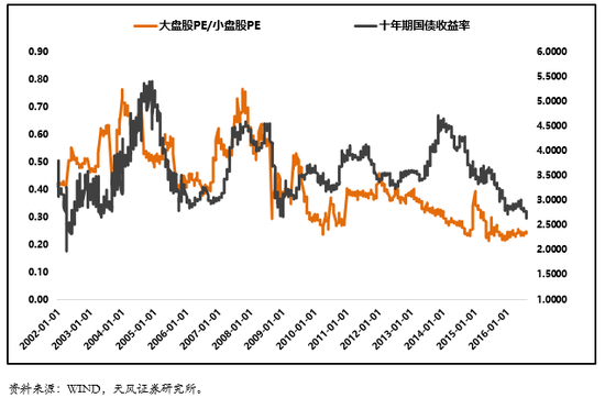 我們通過小盤股PE與大盤股PE的比值來區(qū)分風(fēng)格的變化,用10年期國債收益率來表示利率的絕對(duì)水平。通過下面的圖,你很容易發(fā)現(xiàn),當(dāng)無風(fēng)險(xiǎn)利率下降的時(shí)候,小盤股PE相對(duì)大盤股PE上升更快。相反,當(dāng)無風(fēng)險(xiǎn)利率上升的時(shí)候,小盤股PE相對(duì)大盤股PE下降更快。