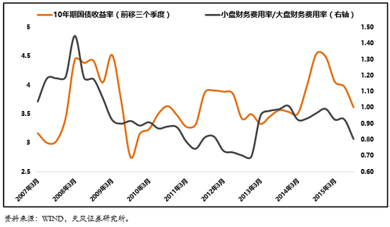 下圖中,我們也用數(shù)據(jù)證明了這一點(diǎn)。由于資金利率改變后,借貸成本反映在財(cái)務(wù)報(bào)表上具有一定的時(shí)滯,所以在我們把以10年期國債收益率代表的資金價(jià)格向前移動(dòng)3個(gè)季度后,就可以發(fā)現(xiàn),當(dāng)資金價(jià)格上升時(shí),小盤股的財(cái)務(wù)費(fèi)用率相對(duì)大盤股有更加明顯的上升,而當(dāng)資金價(jià)格下降時(shí),小盤股的財(cái)務(wù)費(fèi)用率相對(duì)大盤股同樣有更加明顯的下降。