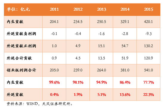 言歸正傳,不管是從直觀印象,還是數(shù)據(jù)來看,外延并購對(duì)創(chuàng)業(yè)板的盈利來說發(fā)揮著越來越重要的作用,2015年創(chuàng)業(yè)板公司的全部利潤中,你會(huì)發(fā)現(xiàn)有超過22%來自于收購后并表的公司,而創(chuàng)業(yè)板2015年全年20%多的盈利增速中,外延收購的標(biāo)的貢獻(xiàn)了10%以上的增速。