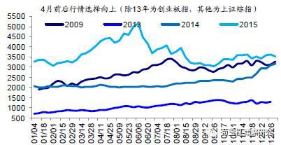 經(jīng)濟(jì)和政策決定4月是行情選擇方向的窗口。08年以來(lái)行情往往在4月選擇方向,按行情走勢(shì)可分為為三種,牛市如2009、2013、2014、2015年,熊市如2008、2011年,震蕩市如2010、2012、2016年。行情在4月前后選擇方向是由中國(guó)政策和經(jīng)濟(jì)因素共同決定的,我國(guó)一般在3月初-3月中召開(kāi)兩會(huì),奠定全年政策主基調(diào),加之春節(jié)多在2月前后,由此一季度經(jīng)濟(jì)進(jìn)入淡季,市場(chǎng)關(guān)注度較低。在4月前后,企業(yè)盈利和宏觀經(jīng)濟(jì)數(shù)據(jù)逐漸明朗,全國(guó)兩會(huì)結(jié)束后政策主線也逐漸清晰,行情決斷時(shí)刻來(lái)臨。4月前后市場(chǎng)選擇上漲的情形得益于政策放松和基本面好轉(zhuǎn),09年4萬(wàn)億投資計(jì)劃帶動(dòng)信貸放量,13年中小創(chuàng)業(yè)績(jī)超預(yù)期,中小創(chuàng)迎來(lái)結(jié)構(gòu)性行情,14年3月市場(chǎng)回撤,年中開(kāi)始上漲,11月央行降息后加速上漲,15年3月央行繼續(xù)降準(zhǔn)降息,牛市行情延續(xù)。4月前后市場(chǎng)選擇下跌的情形源于政策收緊和基本面惡化,08年通脹高企迫使央行連續(xù)加準(zhǔn),基本面開(kāi)始惡化,11年1月新國(guó)八條出臺(tái),通脹抬頭迫使央行加息加準(zhǔn)。4月前后市場(chǎng)選擇震蕩的情形,是因?yàn)?月政策階段性偏緊,導(dǎo)致悲觀情緒強(qiáng)化,全年看市場(chǎng)先跌后漲。10年房地產(chǎn)調(diào)控和貨幣信貸收緊,股指期貨和融資融券正式推出,市場(chǎng)情緒非常悲觀,4月后市場(chǎng)開(kāi)始下跌,7月后行情開(kāi)始反彈。12年溫家寶指出房?jī)r(jià)還遠(yuǎn)沒(méi)有回到合理價(jià)位,調(diào)控不能放松,市場(chǎng)預(yù)期較為悲觀,3月中市場(chǎng)開(kāi)始下跌,年底銀行股率先反彈。16年債券違約事件頻發(fā),通脹壓力抬升,4月中市場(chǎng)開(kāi)始下跌,下半年經(jīng)濟(jì)數(shù)據(jù)改善,市場(chǎng)隨之上漲。