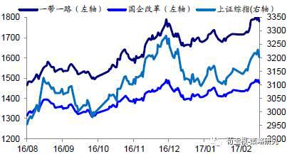 國(guó)內(nèi)外積極因素出現(xiàn)。目前國(guó)內(nèi)外的積極因素正在逐漸累積,不必?fù)?dān)心當(dāng)下,春季躁動(dòng)行情仍會(huì)繼續(xù)。國(guó)內(nèi)從地方兩會(huì)到國(guó)家兩會(huì)將陸續(xù)召開(kāi),未來(lái)迎來(lái)政策密集期,國(guó)企改革及一帶一路持續(xù)推進(jìn)等。2月16日上海召開(kāi)國(guó)資委國(guó)企工作會(huì)議,提出17年將著力深化混改,推進(jìn)員工持股、整體上市、科研院所制及燃?xì)鈽I(yè)混改,新一批國(guó)企股權(quán)將劃入國(guó)資流動(dòng)平臺(tái),深化市管?chē)?guó)企領(lǐng)導(dǎo)薪酬制度改革,新增投資4000億元投向戰(zhàn)略新興產(chǎn)業(yè)等四大領(lǐng)域。在16年12月的中央經(jīng)濟(jì)工作會(huì)議和1月的達(dá)沃斯論壇上,習(xí)主席多次提出推進(jìn)“一帶一路”建設(shè),并表示5月將舉辦“一帶一路”國(guó)際合作高峰論壇。近期市場(chǎng)上漲的主線也主要圍繞這兩大主題展開(kāi),2月至今國(guó)企改革和一帶一路指數(shù)漲幅分別為2.8%和3.7%,而同期上漲綜指為1.4%。國(guó)外美股和港股漲勢(shì)強(qiáng)勁,受益于特朗普新政預(yù)期,美股三大股指均創(chuàng)歷史新高,今年以來(lái)恒生指數(shù)漲幅達(dá)到9.25%,外圍市場(chǎng)強(qiáng)勁表現(xiàn)利于提振投資者風(fēng)險(xiǎn)偏好。南方A50為代表的ETF份額回升、滬港通深港通北上凈流入資金增加表明海外資金對(duì)于A股興趣恢復(fù)中。未來(lái)需關(guān)注國(guó)內(nèi)去杠桿會(huì)否導(dǎo)致債務(wù)違約沖擊市場(chǎng)信心,以及海外特朗普邊境稅進(jìn)展及對(duì)中國(guó)可能的影響。