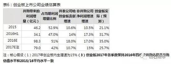2013年-2016年,創(chuàng)業(yè)板上市公司重大資產(chǎn)重組收購公司205家次,并購合計(jì)對(duì)價(jià)1842億,產(chǎn)生商譽(yù)1470億,商譽(yù)占創(chuàng)業(yè)板總資產(chǎn)達(dá)到12%。2015年,并購并表為創(chuàng)業(yè)板帶來利潤增量46.2億,占當(dāng)期利潤增量52.9%,2016年預(yù)計(jì)并購貢獻(xiàn)為50%,并購并表貢獻(xiàn)了創(chuàng)業(yè)板一半增速。