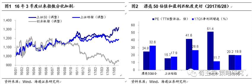 漂亮50興起主要源于估值和盈利匹配度更優(yōu)。16年1月底上證綜指2638點時《A股見底了嗎?》及《用望遠鏡看,A股處于什么階段?-20160408》等多篇報告,我們一直強調5178點到2638點,單邊下跌已結束,1月底開始已經市場中期步入震蕩市,通過時間消化估值。《股市,到底掙什么錢——以美國80年歷史為鑒-20160524》、《震蕩市,結構勝于擇時-20160621》提出震蕩市業(yè)績?yōu)橥酰Y構比擇時更重要,投資者更加追求估值和業(yè)績的匹配度,市場風格悄然從成長切換到價值。漂亮50的興起主要是因為其估值和盈利匹配度更好,目前漂亮50組合PE(TTM整體法)為24.8倍,上證綜指、中小板、創(chuàng)業(yè)板、全部A股為15.7倍、41.6倍、51.4倍、20.2倍,經過大幅上漲后漂亮50估值處于中等水平,但其17Q1凈利潤增速高達32.6%,遠高于上證綜指、中小板、創(chuàng)業(yè)板、全部A股的17.9%、26.6%、11.7%、19.9%,目前漂亮50組合PEG只有0.76,可以說是A股中估值和盈利匹配度最好的一組股票,在震蕩市中受到了投資者的追捧。