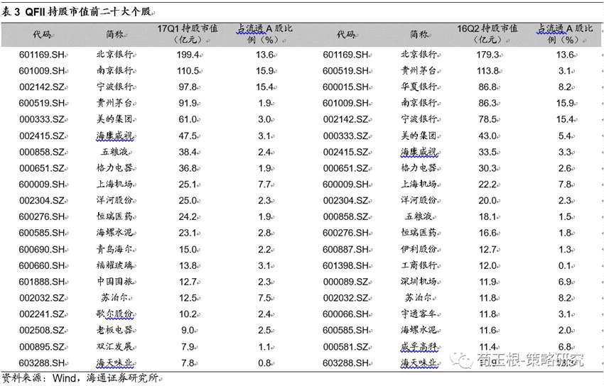 過去一年公募基金大幅買入漂亮50。我們根據(jù)上市公司財報中披露的前十大流通股東,統(tǒng)計漂亮50組合投資者結構,來看一下過去一年多哪類投資者在買入漂亮50。統(tǒng)計結果表明剔除掉法人股后,漂亮50組合投資者結構中散戶占比保持不變,16Q1和17Q1都是67%,機構投資者中公募基金占比上升明顯,由16Q1的10.7%升至17Q1的13.7%,同期保險占比從12.6%降至11.5%,QFII占比從3.8%降至2.8%。我們通過公募基金披露持股數(shù)據(jù)做進一步的驗證,公募基金重倉股中持有的漂亮50組合市值由16Q1的613億升至17Q1的1238億,在公募基金重倉股總市值占比由16Q1的11.9%升至17Q1的22.3%,意味著公募基金近1/4持倉是漂亮50組合。如果看基金重倉前十大個股變化也可以看出此趨勢,16Q1持股金額最大的為網(wǎng)宿科技、宋城演藝,前十大重倉股中有一半為成長股,而到17Q1前十大已經全部是格力電器、貴州茅臺、伊利股份等漂亮50組合個股,且相比一年前持股集中度大幅上升。此外,雖然QFII在漂亮50投資者結構中占比略有下降,但其自身持倉中漂亮50占比較大,17年一季度QFII持股市值1144億,其中持有漂亮50個股市值達427.6億,占QFII總金額的37.4%,貴州茅臺、??低?、格力電器等多只漂亮50個股都在其前十大重倉股中。