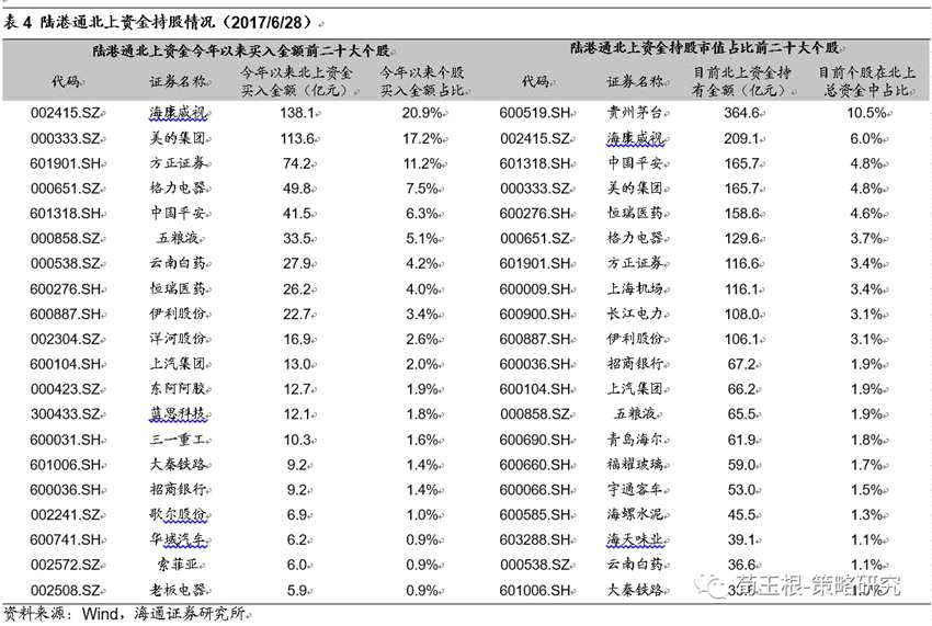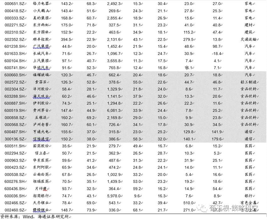 陸港通北上資金不斷買入漂亮50。除了上市公司十大流通股東外,還有部分投資者未在公司財報中披露,其中就包括陸港通資金,這也是漂亮50買入的主力。今年以來北上資金持續(xù)流入,其中滬股通北上資金269億,深股通北上資金702,合計971億。通過對北上資金每日買入十大活躍個股進行統(tǒng)計,今年以來買入金額前十大個股占總金額的82%,其中有9只為漂亮50個股,占總金額的71%,十大買入個股分別為??低暎?38億)、美的集團(114億)、方正證券(74億)、格力電器(50億)、中國平安(42億)、五糧液(34億)、云南白藥(28億)、恒瑞醫(yī)藥(26億)、伊利股份(23億)、洋河股份(17億),買入市值占比最大的5個行業(yè)分別為家電(25.2%)、電子(25.1%)、非銀(15.6%)、醫(yī)藥(10.5%)、食品飲料(9.9%),主要為大消費股票(包含消費電子)。去年以來A股漂亮50的崛起,陸港通北上資金起了很大的推動作用。