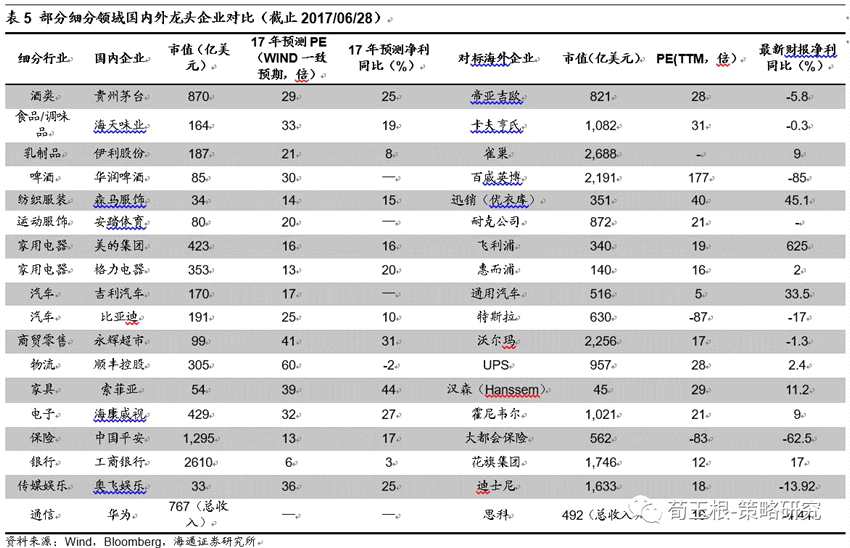 A股國際化加速,漂亮50與美股港股同步走牛。A股漂亮50走出獨立行情和A股國際化加速的大背景有關,中證100和上證50為代表的漂亮50走出獨立強勢的時點正好是16年3季度末,16年8月16日國務院批準《深港通實施方案》,并于當日取消滬港通、深港通總額度限制,那時至今,中證100、恒生指數(shù)、標普500、上證50、上證綜指、中小板指、創(chuàng)業(yè)板指漲跌幅分別為13.7%、13.3%、12.1%、11.6%、2.0%、-0.8%、-17.3%,中證100和上證50基本與港股、美股同步走牛,且漲跌幅大致相同。其實A股國際化幾年前就已經發(fā)生,從2014年11月17日滬港通正式開通交易,到2016年12月5日正式啟動深港通,再到如今A股順利入摩,A股的國際化正在加速。而在此背景下,龍頭公司更容易全球對標。雖然A股整體PE水平高于美股、港股,一線價值藍籌股中,白酒龍頭PE略高于海外龍頭,家電和銀行仍明顯偏低。格力電器PE為15倍,對應17年Q1凈利同比為27%,而海外龍頭惠而浦PE(TTM)為16倍,17年Q1凈利同比為2%。工商銀行PE為6倍,對應17年Q1凈利同比為1.4%,而美股龍頭花旗銀行PE為12倍,對應17年Q1凈利同比為17%。