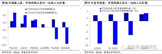 市場已在好轉,風格正從一九向三七擴散。6月4日《再次開啟多頭思維》轉向樂觀,核心邏輯是金融監(jiān)管政策和資金面步入轉折期,且國企改革推進助推風險偏好。6月10日《雨后彩虹——2017年中期A股投資策略》重申看多邏輯,提出市場進入雨后彩虹階段。過去三周多,政策面和資金面已經在發(fā)生變化,股市也確實在上漲,滬深300已經突破17年4月中和16年12月初高點,創(chuàng)16年1月底這輪上漲以來的新高,上證50和中證100已經回到15年底的高點,呈現(xiàn)了牛市形態(tài)。我們維持樂觀觀點,建議保持多頭思維。7-8月將公布2季度盈利數(shù)據(jù),預計A股整體上半年凈利潤同比18%、全年14%,盈利保持高增長有望確認。此外,隨著十九大臨近,國企改革尤其是混改有望有突破。此外,此前多篇報告提出“業(yè)績?yōu)橥躏L格不變,從一九向三七擴散,持有消費白馬和金融等一線價值股,看好二線價值成長和國企改革”。17/06/04至今,上證50、中證100、滬深300、中證500漲跌幅分別為2.5%、4.2%、4.6%、5.4%,而17/01/01-06/03期間分別為8.2%、9.9%、5.3%、-7.8%,市場確實從以上證50和中證100為代表的一線價值藍籌股擴散到以滬深300和中證500為代表的二線價值成長股,整體結構更加均衡。從個股看,總市值為0-50、50-100、100-500、500億元以上的公司在17/06/04至今期間漲跌幅均值分別為4.3%、4.9%、6.0%、5.0%,而在2017/01/01-06/03期間分別為-16.5%、-17.3%、-10.3%、5.8%,今年1-5月總市值超500億元的一線價值藍籌股表現(xiàn)一枝獨秀,6月以來總市值為100-500億元二線價值成長股表現(xiàn)更優(yōu),投資風格正在從一九向三七擴散。