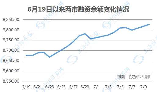 統(tǒng)計(jì)發(fā)現(xiàn),自大盤從6月19日緩慢震蕩攀升以來,兩市融資余額也是節(jié)節(jié)走高(見下圖),除了3個(gè)交易日外,其他13個(gè)交易日都呈凈流入狀態(tài)。截至7月10日,兩市融資余額為8827.75億元,這也是近兩個(gè)月來的新高。杠桿資金源源不斷的入市,正顯示了市場情緒在回暖,投資者信心在提升。