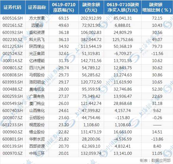 同時(shí)觀察6月19日以來的個(gè)股融資情況可以發(fā)現(xiàn),其間漲幅超過20%的20只個(gè)股中(見下表),除了光正集團(tuán)、云鋁股份、華新水泥3只個(gè)股的融資余額小幅減少外,其他17只個(gè)股的融資金額都呈凈流入態(tài)勢。其中,方大炭素、陜西煤業(yè)的融資余額增加了近80%,晨鳴紙業(yè)、科大訊飛增加了近50%。這表明,個(gè)股融資額增加與股價(jià)走強(qiáng)之間存在著較強(qiáng)的正相關(guān)。