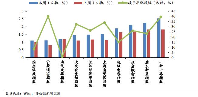 換手率排名后十的分別是國(guó)企混改指數(shù)1.10 %、滬股通50指數(shù)1.12%、油氣改革指數(shù)1.20 %、大央企重組指數(shù)1.46 %、長(zhǎng)江經(jīng)濟(jì)帶指數(shù)1.47 %、上海自貿(mào)區(qū)指數(shù)1.52 %、超級(jí)電容指數(shù)1.88 %、證金概念指數(shù)2.10 %、浦東新區(qū)指數(shù)2.23 %、一帶一路指數(shù)2.54 %。
