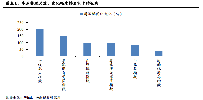 本周轉(zhuǎn)跌為漲的僅有六個(gè)板塊,(周漲幅,漲幅環(huán)比變化)分別為一線(xiàn)龍頭指數(shù)(0.71 %,199.06%),粵港澳自貿(mào)區(qū)指數(shù)(0.65%,150.58%),在線(xiàn)旅游指數(shù)(0.00 %,99.87 %),粵港澳大灣區(qū)指數(shù)(-0.03 %,98.46 %),白馬股指數(shù)(-0.30 %, 80.42 %)和海南旅游島指數(shù)(-0.51 %,39.61 %)。