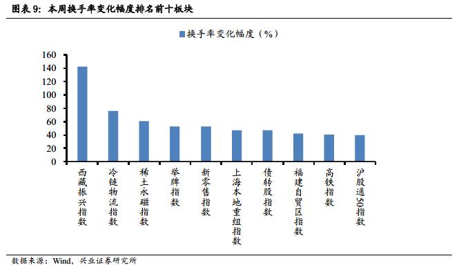 本周西藏振興指數(shù)換手率增幅居首,高達(dá)141.66%,電動(dòng)汽車(chē)板塊中稀土永磁指數(shù)換手增幅進(jìn)入前十,為60.68%。換手率變化幅度排名前十的還有:(本周換手率,換手率變化幅度)分別是冷鏈物流指數(shù)(22.64%,75.62 %),舉牌指數(shù)(3.79 %,52.83 %),新零售指數(shù)(9.57 %,52.77 %),上海本地重組指數(shù)(3.18 %,47.31 %),債轉(zhuǎn)股指數(shù)(6.29 %,46.76 %),福建自貿(mào)區(qū)指數(shù)(7.85 %,42.01 %),高鐵指數(shù)(3.99 %,40.77 %)和滬股通50指數(shù)(1.12 %,40.05 %)。