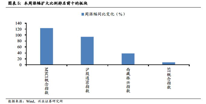 周漲跌幅環(huán)比變化方面,170個(gè)指數(shù),僅4個(gè)指數(shù)延續(xù)上周漲勢(shì),且周漲幅超過(guò)上周,“中國(guó)核心資產(chǎn)概念”漲幅繼續(xù)擴(kuò)大,其中MSCI概念指數(shù)(本周上漲0.73%)漲幅環(huán)比增加123.05%,滬股通50指數(shù)(本周上漲1.33%)漲幅環(huán)比增加94.13%。延續(xù)漲勢(shì)且漲幅擴(kuò)大的還有(漲幅,漲幅環(huán)比增加):西藏振興指數(shù)(5.30%,38.25 %),ST概念指數(shù)(0.97%,7.84 %)。