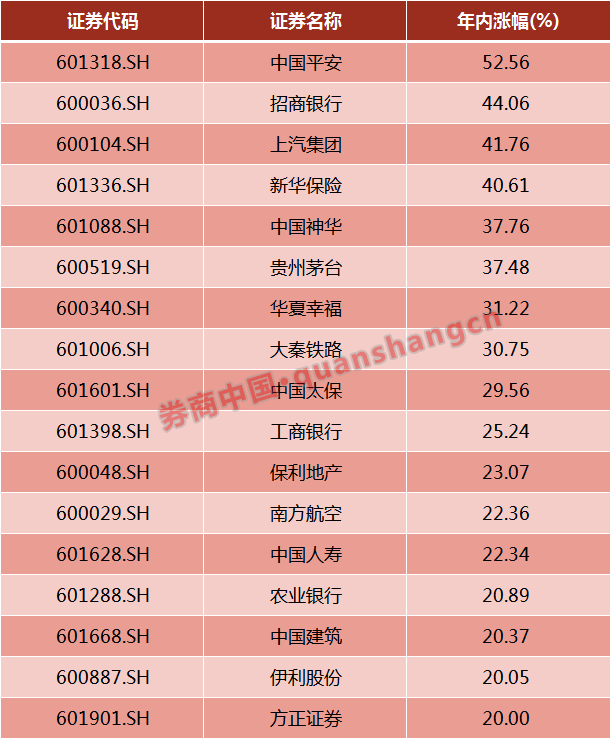 指數(shù)漲幅不俗,個股漲幅更是驚人。中國平安成功從貴州茅臺手里接過市場關(guān)注,成為上證50中最牛個股,今年以來共計上漲了52.56%,其次漲幅較大的成分股還包括招商銀行、上汽集團(tuán)和新華保險,年內(nèi)漲幅分別達(dá)到44.06%、41.76%和40.61%。同時,話題明星貴州茅臺年內(nèi)漲幅為37.48%,在上證50中只能排名第6。