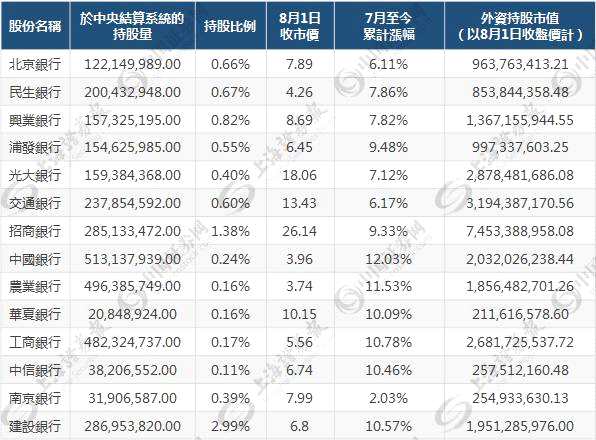 滬股通標(biāo)的中銀行股7月漲幅情況及外資持股市值一覽