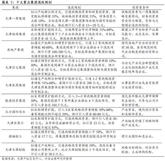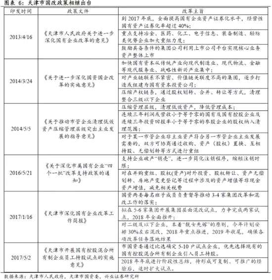 ——國改進(jìn)度時間表明確,天津國改決心已定。2017年1月的《國有企業(yè)改革工作簡報》明確指出,擬開展5-6家集團(tuán)層面混改試點,力爭完成兩家,2018年全面推開;今年計劃安排30%左右混改,2018年重點推進(jìn),2019年收尾。